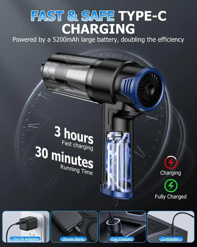 Fast & Safe Type-C ChargingThis handheld vacuum cordless is equipped with a 5200mAh battery and Type-C interface. Charging is safe and efficient, taking 3 hours to full charge, and it supports 30 minutes of continuous use when fully charged. The indicator light shows red while charging and green when fully charged, allowing you to keep track of its charging status in real time. Additionally, it can be easily recharged via a car charger, power bank, making it more convenient to use