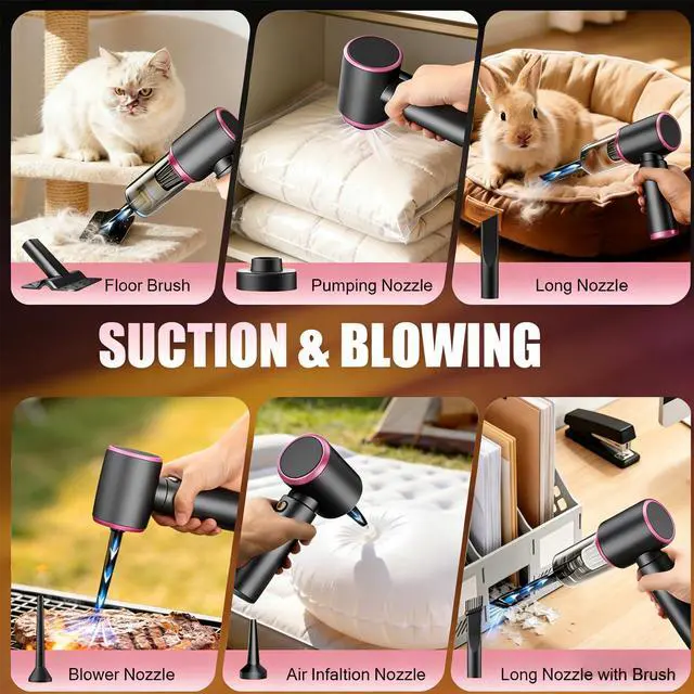 4-in-1 Multifunctional & 7 AccessoriesThis 4-in-1 portable vacuum supports suction, blowing, inflation, and vacuum compression. Equipped with 7 different attachments including floor brush, crevice nozzle, and inflatable nozzle, it meets various cleaning needs and is ideal for keyboards, corners, swimming rings, and storage bags.
