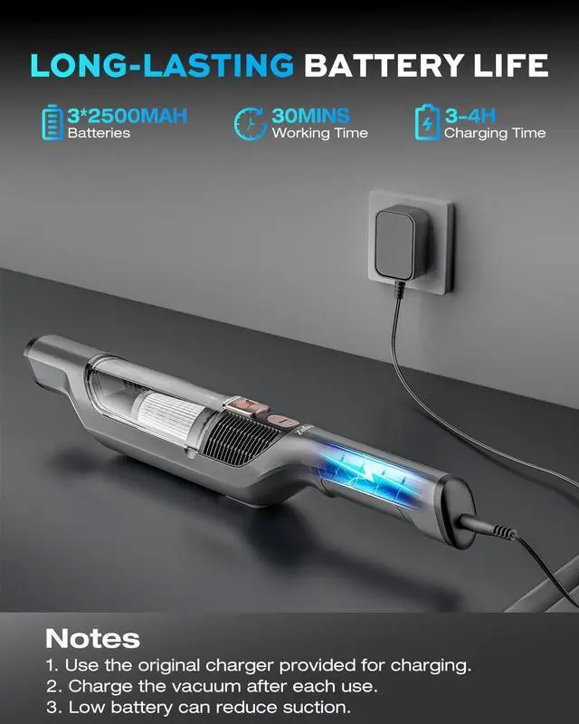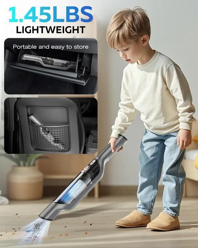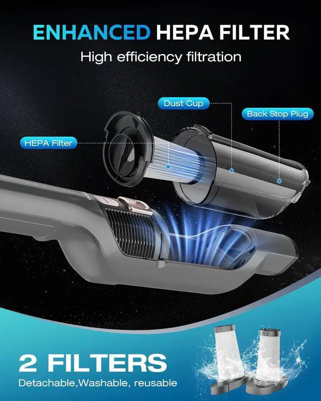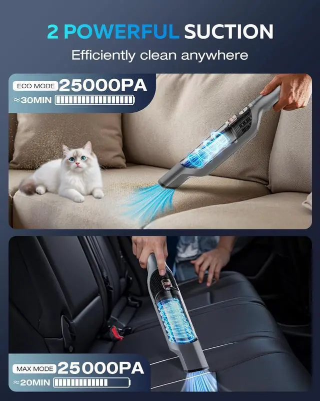 Tackle scattered dust and crumbs effortlessly. This handheld vacuum cleaner is designed to integrate into your daily routine, offering an efficient way to handle small-scale cleaning tasks. It features powerful 25000PA suction that easily picks up snack crumbs from sofa crevices, dust under car seats, and fine debris between keyboard keys. The cordless design allows you to move freely without searching for power outletsready for quick use from the living room to the garage. Equipped with multiple specialized nozzles, it adapts to different scenarios: use the wide nozzle for seats and bedding, and the crevice tool to reach deep into tight corners and window tracks. The washable filter helps maintain consistent suction and can reduce long-term maintenance costs. Lightweight and comfortable to hold, its sleek silver-gray finish fits discreetly into your home. A single charge supports multiple quick cleanups, making it suitable for managing sudden pet food spills, hair on carpets, or paper shreds around your desk. While not intended to replace your main vacuum, it serves as a practical tool for maintaining tidiness and handling everyday messes quickly. If you're looking for a flexible, easy-to-use cleaning tool thats ready when you are, this compact vacuum offers a convenient solution.