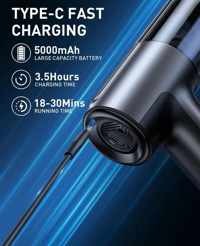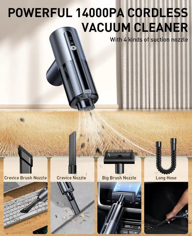 - Car vacuum cleaner uses brushless motor technology compared to ordinary brushed motors, it can effectively reduce wear and tear and extend the life of the car vacuum cleaner. It also has a fast heat dissipation function to avoid performance degradation due to overheating, making your cleaning work smoother.