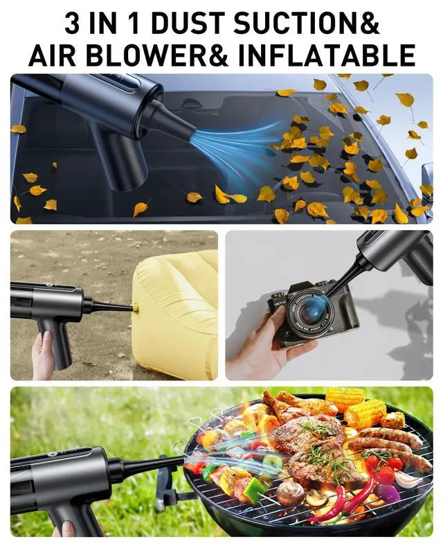 - Three Kinds of Blowing Nozzle: Easily blows away dust from keyboards, camera lenses, and pianos; It can also be used to pump up balloons, swimming rings, inflatable mattresses, etc. Or it could be the blower helper for your BBQ.