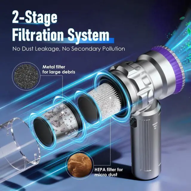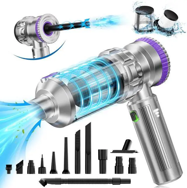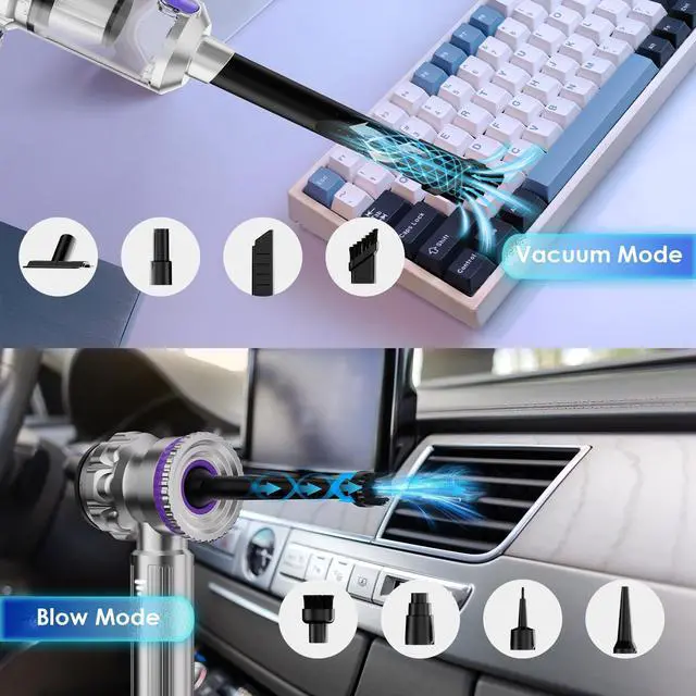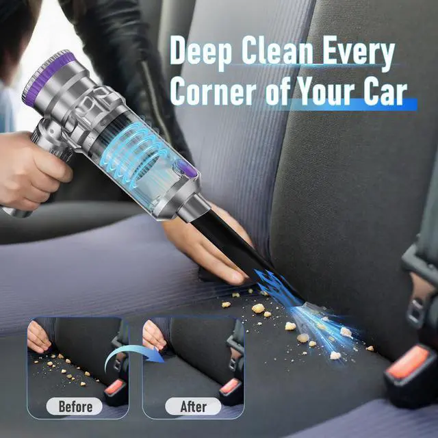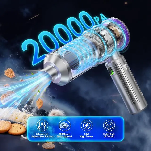 With 3 level adjustment, maximum suction of 20000Pa, it effectively picks up pet hair, dust, crumbs, and debris from car interiors-seats, carpets, floor mats, tight spaces, Home-carpets, hardwood floors, upholstery, furniture, desk, keyboards.