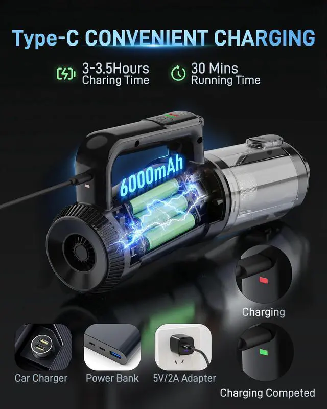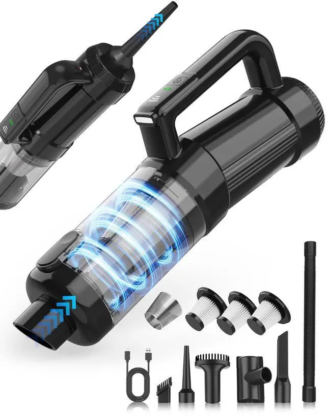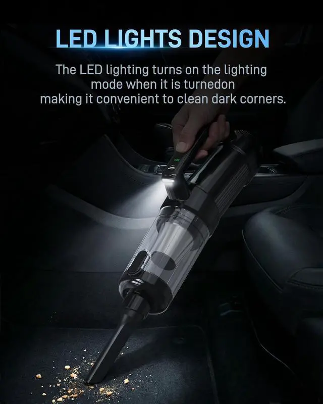 The portable vacuum cordless is equipped with a small brush,a couch brush,a big nozzle,a floor brush,a flat suction nozzle,and a corrugated hose.The flat suction precisely picks up particles from crevices, the couch brush cleans pet hair from desks and sofas, the floor brush removes debris from surfaces, and the a corrugated hose helps you clean narrow spaces like corners, under beds, and window gaps.The blowing nozzle can quickly inflate swim rings, balloons, and similar items.Whats more,This car vacuum cleaner high power is suction power easily picks up dirt, sand, pet hair, and crumbs from seats and floor mats.