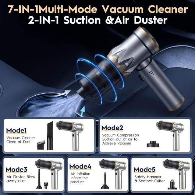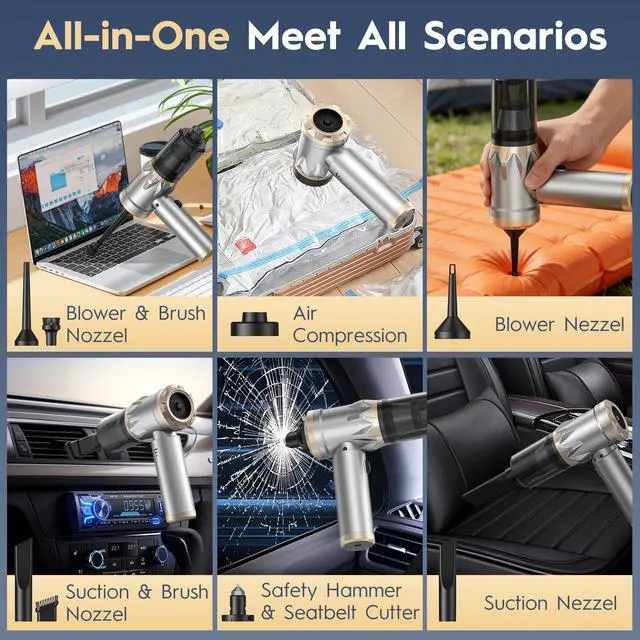 Multi-Function VacuumThis versatile car vacuum comes with 7 specialized attachments, combining vacuuming, blowing, inflating, and scrubbing in one! Multiple essential tools tackle any mess. Plus, it includes a window-breaking accessory to help cut through seatbelts and break windows for emergency escape. Dust removal, inflation, debris blowing, deep cleaning, escape! Your all-in-one car vacuum solution