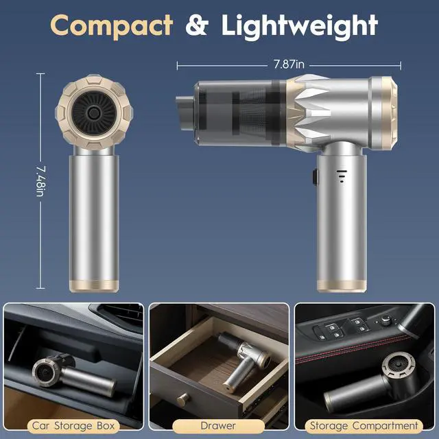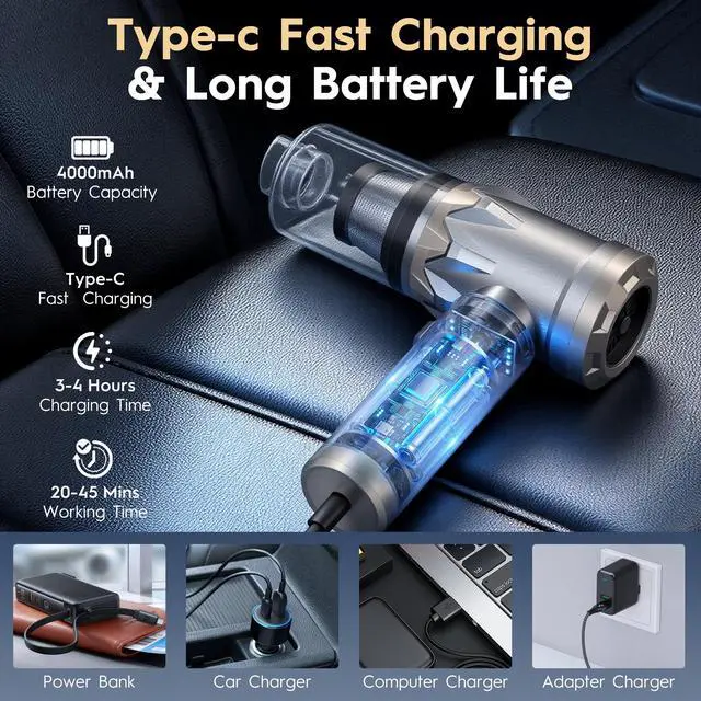 Cord-Free FreedomThis cordless car vacuum empowers you with unrestricted cleaning. Convenient Type-C charging designno outlet needed! Effortlessly portable for in-car use. Say goodbye to cable hassles