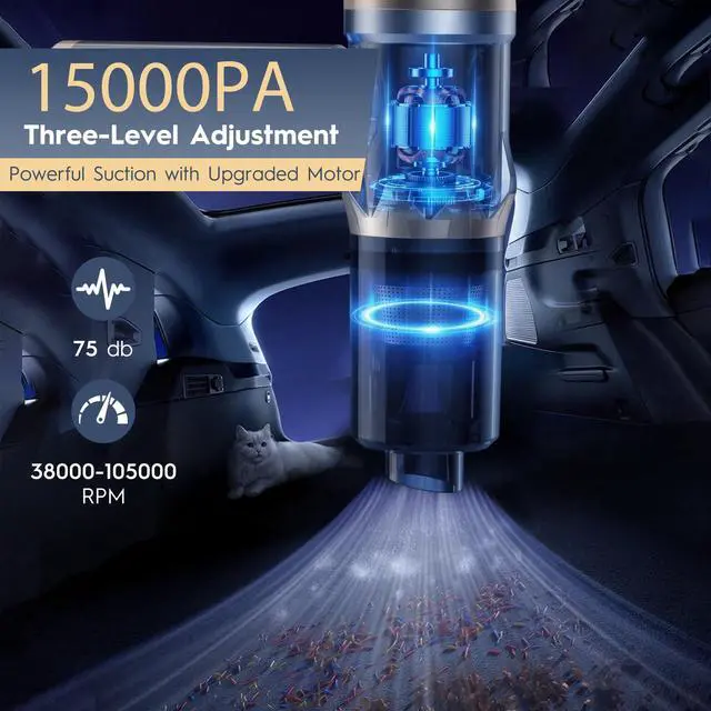 15000Pa Suction PowerThree-speed settings effortlessly clean seats, carpets, and hard-to-reach corners. The essential tool for a dust-free driving experience! Its high-efficiency cleaning performance makes it ideal for daily home and portable cleaning. Ensure the battery is fully charged before first use