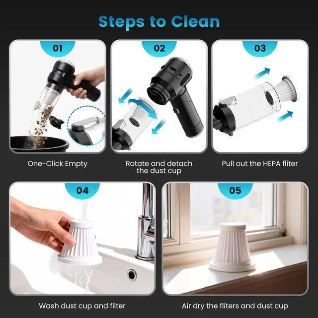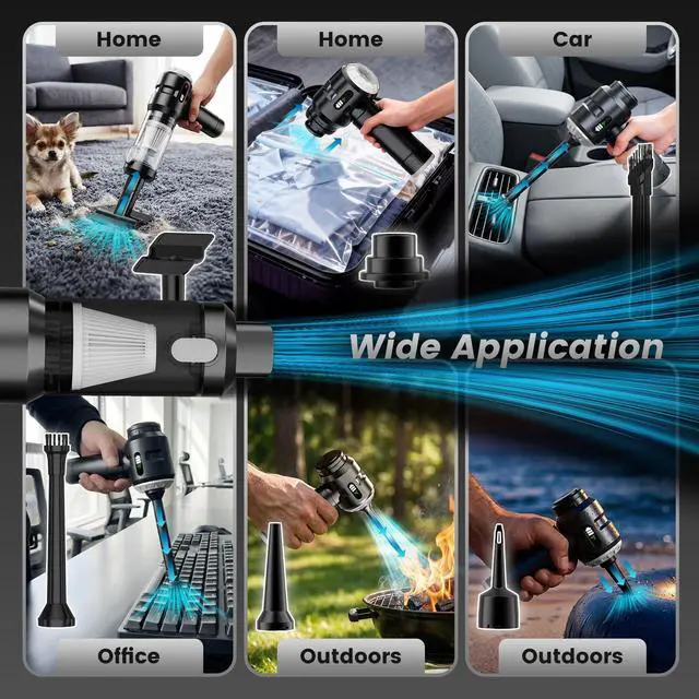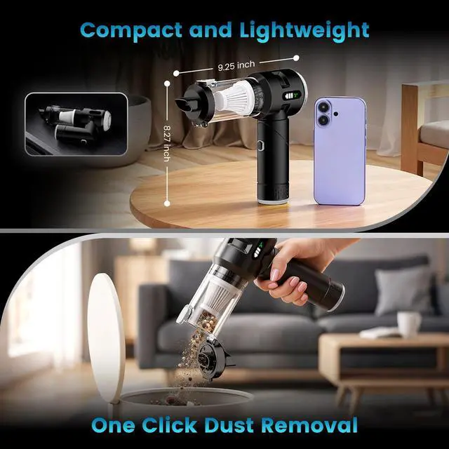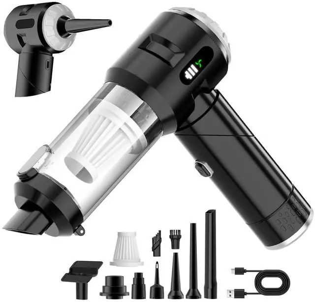 • Multiuse Design:The mini vacuum cleaner is equipped with four functions: suction, blowing, inflation and vacuuming. Strong suction power to thoroughly clean every inch of space. Unique blowing design, to deal with different cleaning challenges.