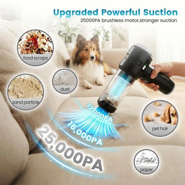 • Upgraded powerful suction: The mini vacuum has a strong suction power, up to 25000PA which is twice that of ordinary handheld vacuum cleaners. This car vacuum cleaner high power Helps you easily clean various small corners, suitable for car interior, kitchen, sofa, windows and so on.