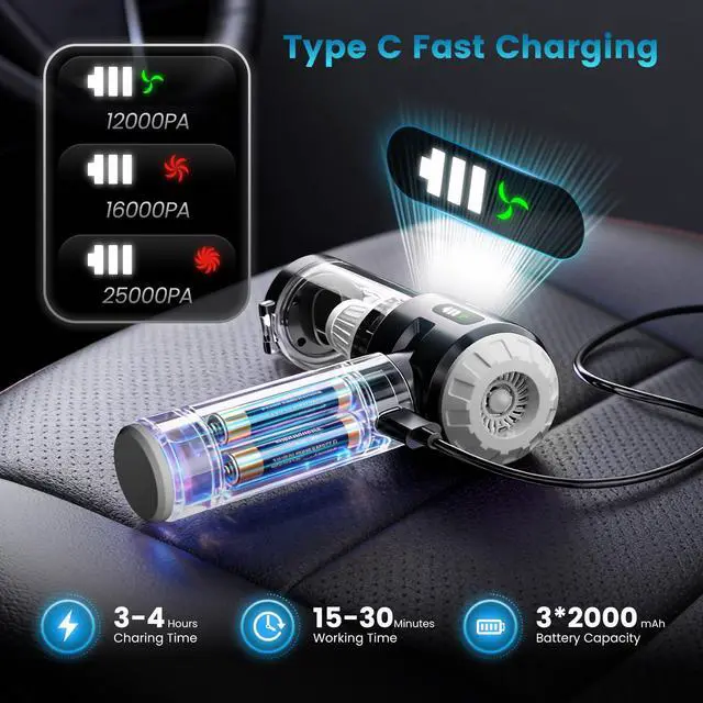 • Fast Charging: Portable and Cordless design make this mini vacuum convenient to be charged anywhere whether in the car or at home. Equipped with a TYPE-C charging cable, the handheld vacuum can be charged with a USB slot, and this car vacuum cleaner high power adopts 6000 mAh battery, and supports Type C charging. It can be quickly fully charge in 3 hours .