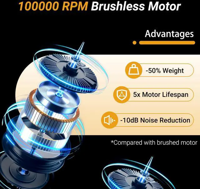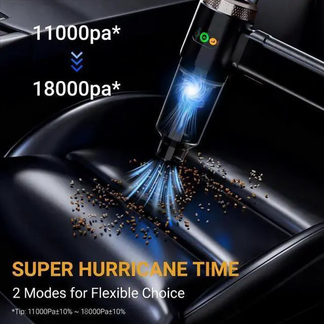 Brushless Motor & 100,000 RPM High Power This portable cordless car vacuum cleaner features a cutting-edge brushless motor, reaching speeds of up to 100,000 RPM and delivering 18,000 Pa of suction power. Compared to traditional motors, the brushless design provides stronger suction, enhanced performance and a longer lifespan.