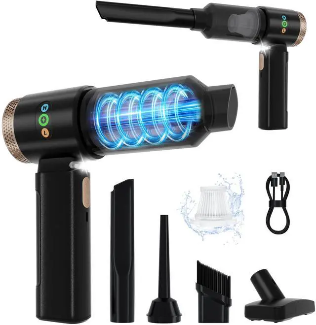 5-in-1 Versatile Car VacuumOur cordless handheld vacuum cleaner offers vacuuming, blowing, inflating and suction, as well as a visible dust light, making it an all-in-one tool. Use the vacuum and blowing functions to easily clear away small debris. Inflate balloons or camping mattresses easily with the inflating feature, or use the blower to boost flames during outdoor activities. Quickly remove air from vacuum storage bags with its powerful suction. All of this is possible with one compact device and its versatile attachments.