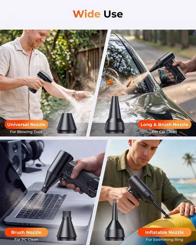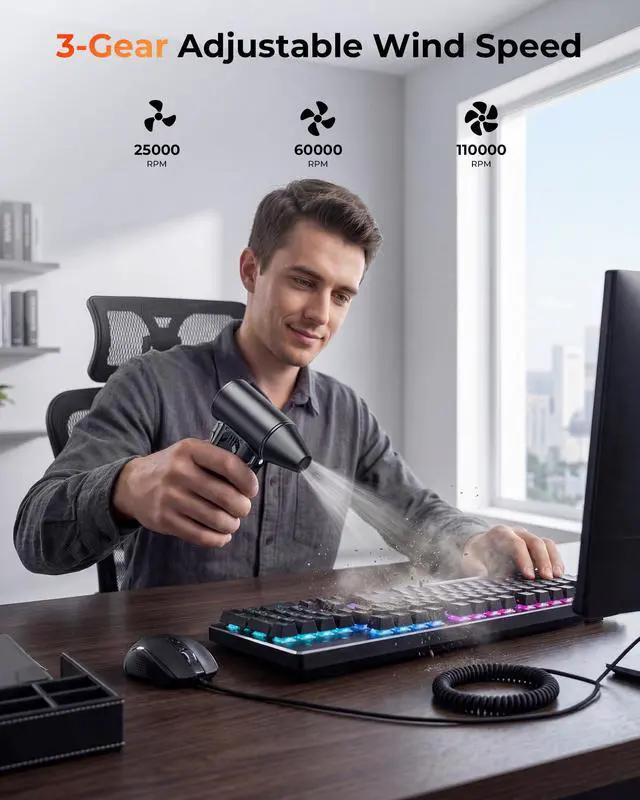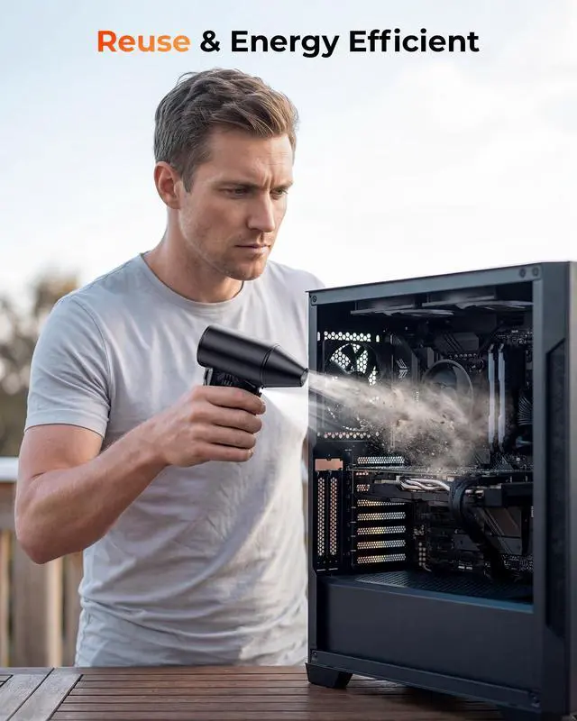 The electric air duster automatically shuts down after 3 minutes of inactivity or if the internal temperature becomes too high, helping to protect the motor and extend product life.