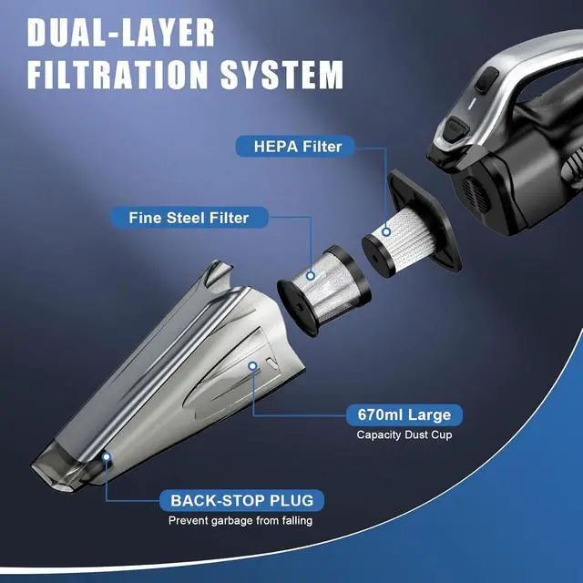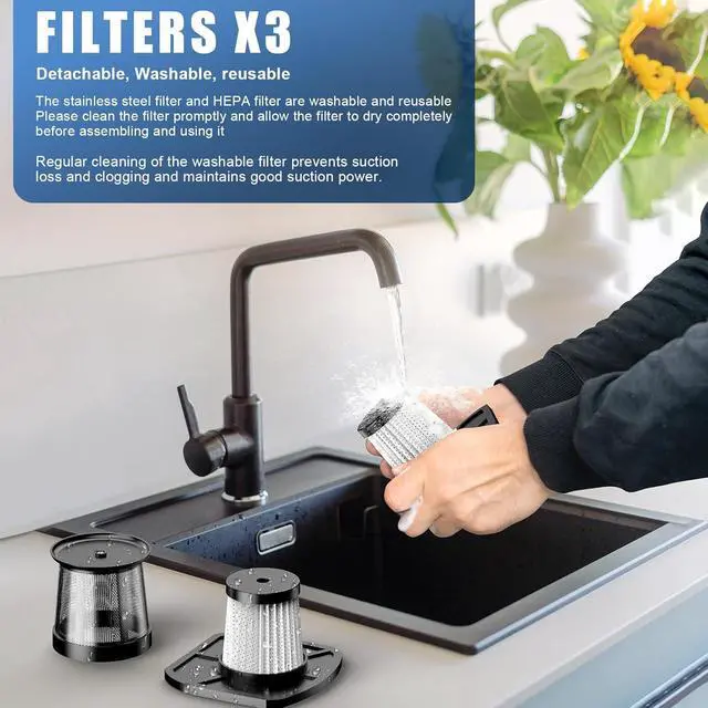 Dual Filtration System & Easy Cleaning: Our cordless vacuum cleaner is equipped with 2 replaceable HEPA filters and 1 washable metal filter, creating a dual filtration system that minimizes the risk of suction loss due to dust clogging. This ensures enhanced cleaning performance and maintains strong suction for long-term use