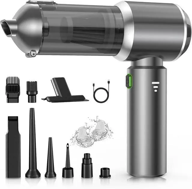 Compact and Easy to CarryThis hand held vacuum cordless is compact and easy to carry. All parts are washable except the vacuum cleaner itself. This high-performance car hoover comes with a USB-C charging cable for charging via a car charger, mobile power supply or other USB source, The battery charging status of the car hoover is shown on the display, which is very convenient!
