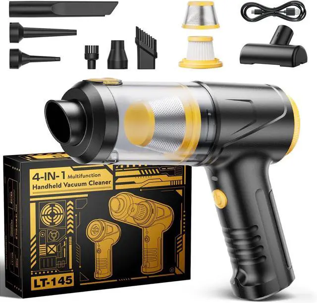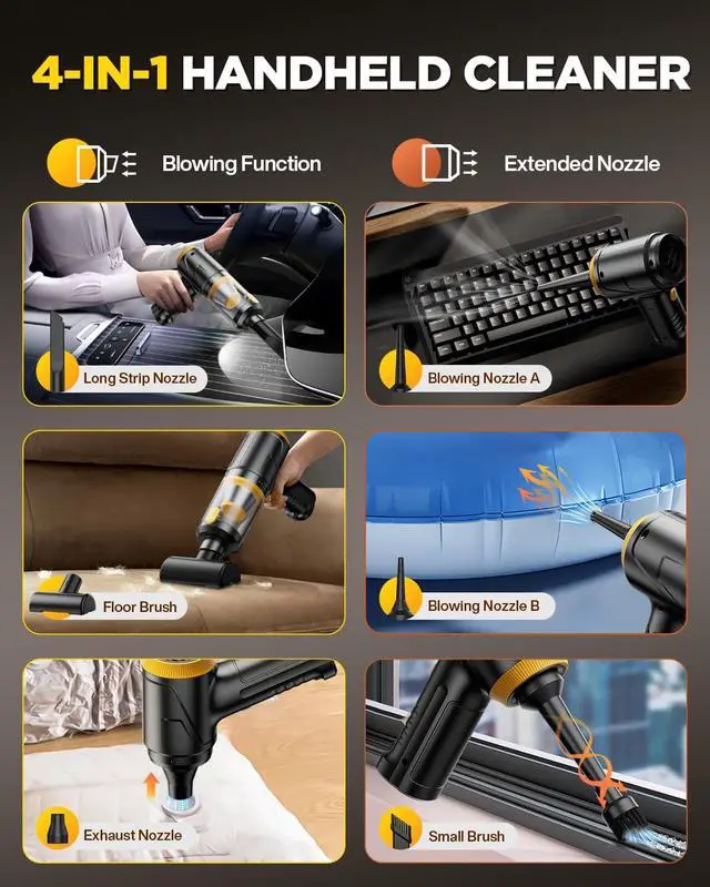 4-in-1 Handheld Vacuum (7 Accessories Included) - One device, endless solutions. Blow away debris from keyboards, vents & electronics. Deep-clean car seats & tight gaps. Rapidly inflate air mattresses, pool floats & balloons. Deflate storage bags fast. 7 practical accessories conquer any cleaning challenge anywhere home, car, or on-the-go