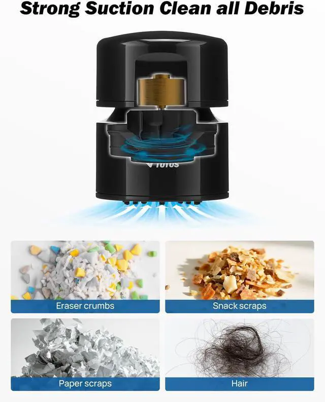 Powerful SuctionThis desktop vacuum cleaner cordless boasts powerful suction, instantly removing dust, debris, pet hair, sand, or food scraps. It features two adjustable suction modes (Eco-friendly/Powerful) to make cleaning a breeze