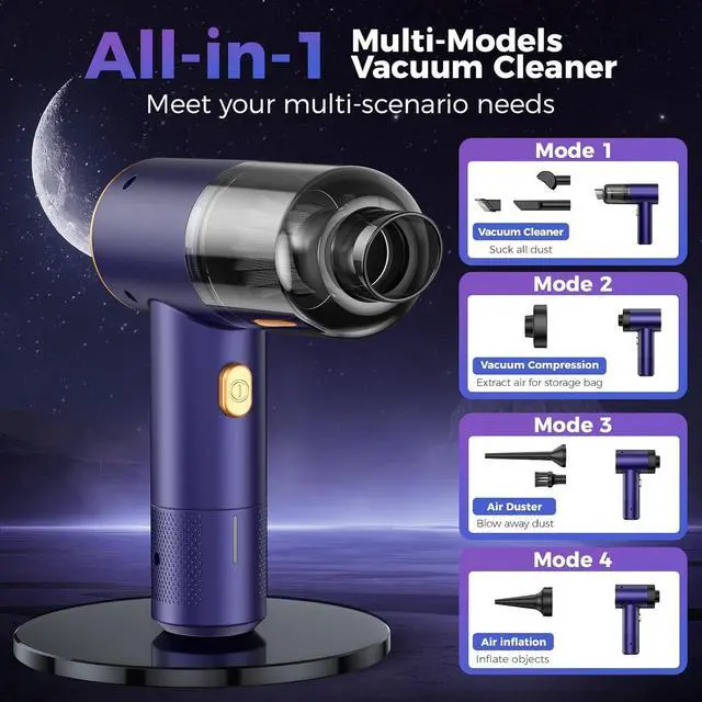 Versatile Attachments for Multi-Surface CleaningCordless vacuum cleaner Includes 7 specialized accessories which can be used for suction, blowing, inflation, and compression, catering to various cleaning needs around the home and car. Including flat nozzle for narrow gaps (e. g., air vents, seat tracks), soft bristle brush for delicate surfaces (dashboards, fabric seats). Air duster and inflation nozzle for daily use. And vacuum compression for storage.