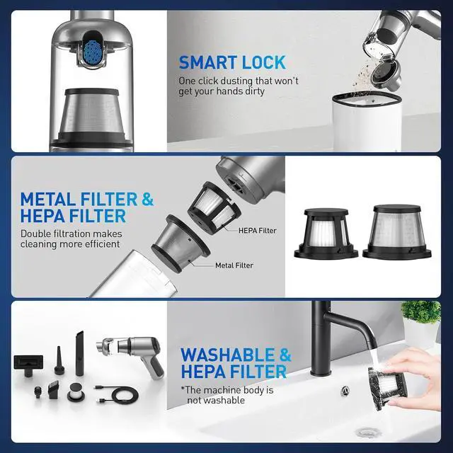 Dual Filtration & Easy EmptyingThis handheld vacuum cordless features a dual filtration system for improved dust management. The first steel mesh filter captures larger particles, while the second is a washable and reusable HEPA filter that traps fine dust and helps protect the motor. The one-touch dust removal design allows you to empty the bin smoothly without dirtying your hands