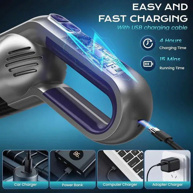 8KPA Powerful Suction Meets Your Daily Cleaning NeedsFeaturing an impressive 8KPA suction power, this car vacuum effectively picks up dust, dirt, and pet hair, making it the perfect companion for quick clean-ups and routine maintenance. 15Min of running time meets your daily cleaning needs, and the more compatible Type-C charging port gives you more charging options.