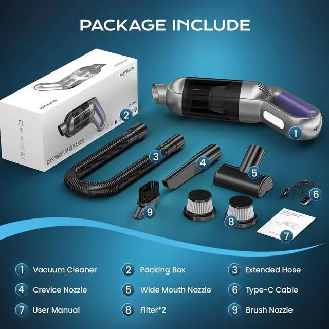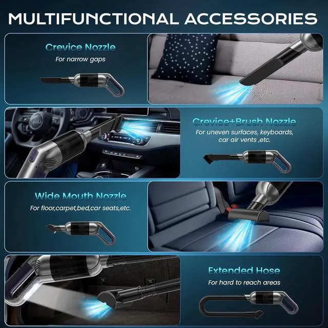 Built-in LED Light & Multifunctional AccessoriesThe built-in LED light illuminates dark corners and tight spaces, ensuring no dust or debris goes unnoticed. Plus, the included multifunctional accessories make this rechargeable hand vacuum versatile enough to handle a variety of cleaning tasks, from car interiors to home furniture and pet hair.