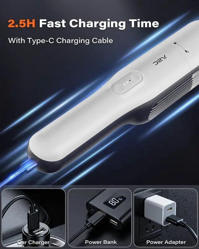 15W Fast Charging: Keep cleaning without pause. Type-C fast charging, this handheld vacuum cordless fully charges in just 2.25 hours. (It is recommended to use a 15W charger to charge the product)