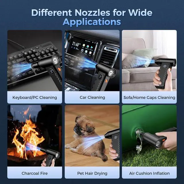 Multi-purpose Cleaning Tool: featuring 4 nozzles and 4 brushes, the dust blower can meet all your cleaning and outdoor needs, it is suitable for cleaning computers, keyboards, cameras, home appliances, car interiors, etc. You can also use it as a jet blower for picnic fires, blowing snow/ leaves, inflating and drying pet hair. With the ultra-bright LED light, you can see and clean every corner simultaneously, even in complete darkness.