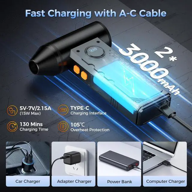 Fast Charing & Long Lasting: comes with two 3000mAh high-capacity battery and a Type-C cable that supports 15W fast charging, the air can duster can be fully charged in 130 minutes, and the maximum use time can reach 120 minutes (in the first gear), making it hassle-free to get the job done in one go. To ensure the best performance of the electric air blower, please fully charge the battery before use.