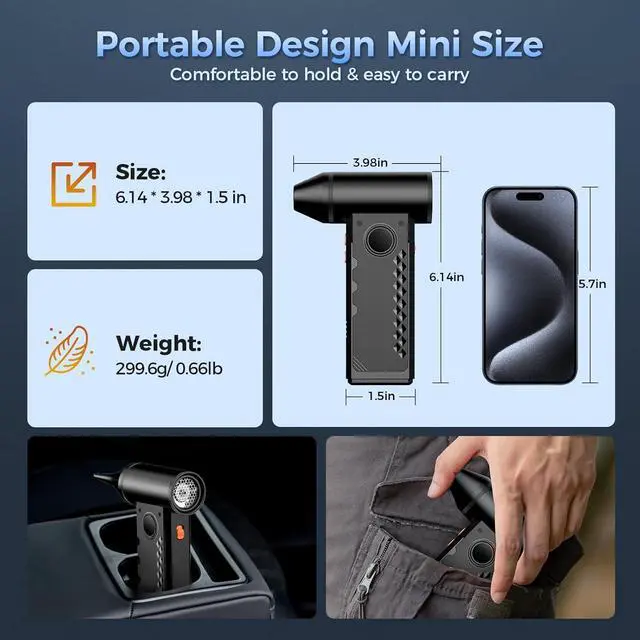 Compact and Portable Design: compact in size and weighing only 0.66 lbs, this mini air blower is a great go-to companion for a more enjoyable life. It is easy to carry and comfortable to hold. You can store it in a toolbox, bag, car cup holder or pocket without taking up much space and use it anywhere when needed, making it a perfect choice for indoor cleaning, outdoor adventures, travel, and camping.