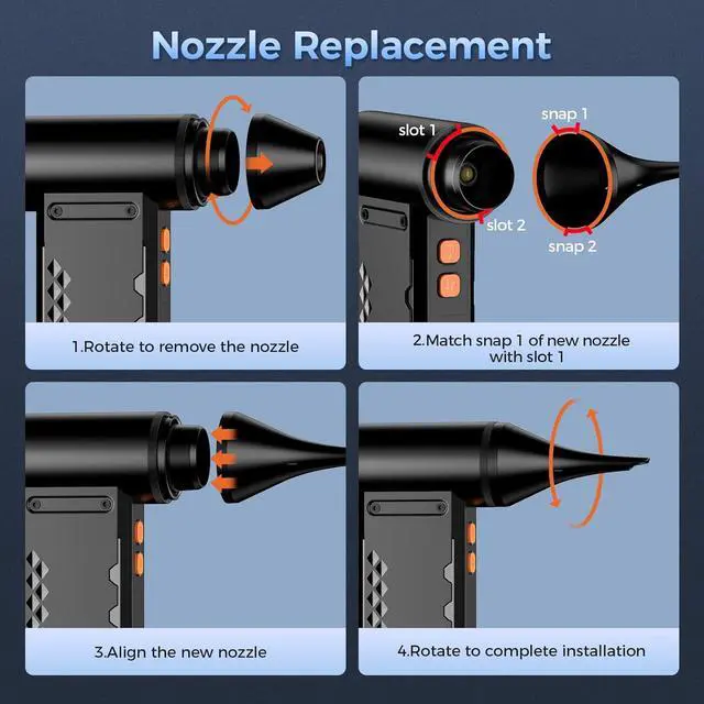Interchangeable Nozzles: no tools needed, the nozzle can be replaced in seconds. Hold and rotate the nozzle to remove it from the blower, align the snaps on the new nozzle with the slots on the portable blower, rotate until the new nozzle is securely installed. Ensure it is properly installed before use.