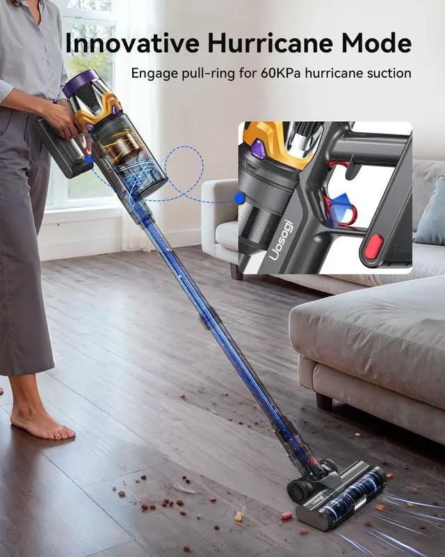 Suction & Hurricane Mode]: Powered by a market-leading 650W motor, this cordless vacuum delivers powerful suction up to 55KPa. With 3 adjustable power modes, it easily handles daily dust, large debris, and pet hair. For the toughest challenges, the innovative pull ring design lets you instantly activate the 4th Hurricane Mode, with a suction power of up to 60Kpa to tackle deep-seated carpet grime and stubborn pet hair with ease.