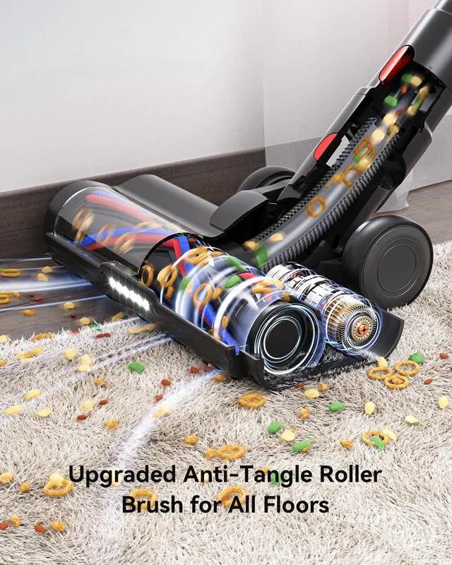 [V-Shaped Anti-Tangle Brush]: Say goodbye to tangled pet hair. The innovative V-shaped brush head, with its integrated comb-teeth, actively prevents hair wrap for effortless cleanup. It also features grooved side brushes that rotate a full 270° and 6 bright LED lights that illuminate under furniture, ensuring no dust is left behind in corners, under beds, or around table legs and sofas.