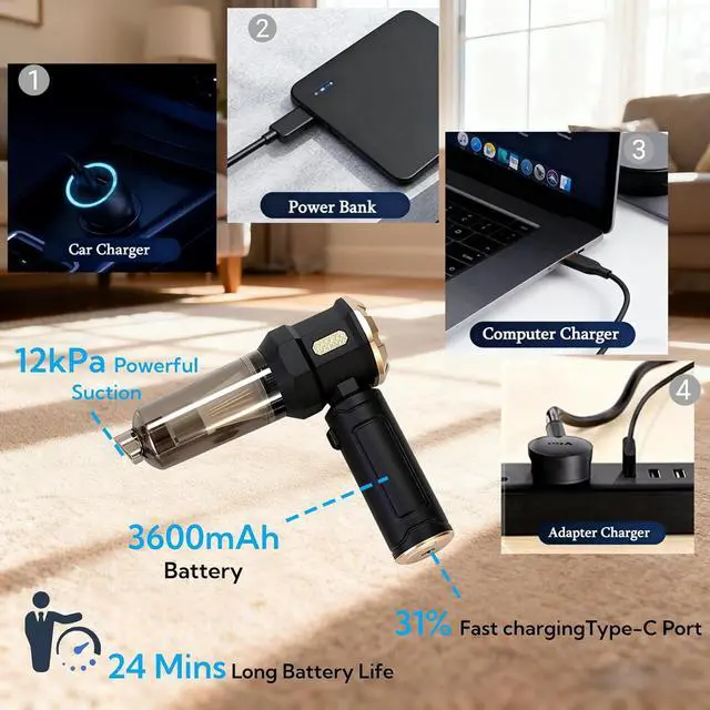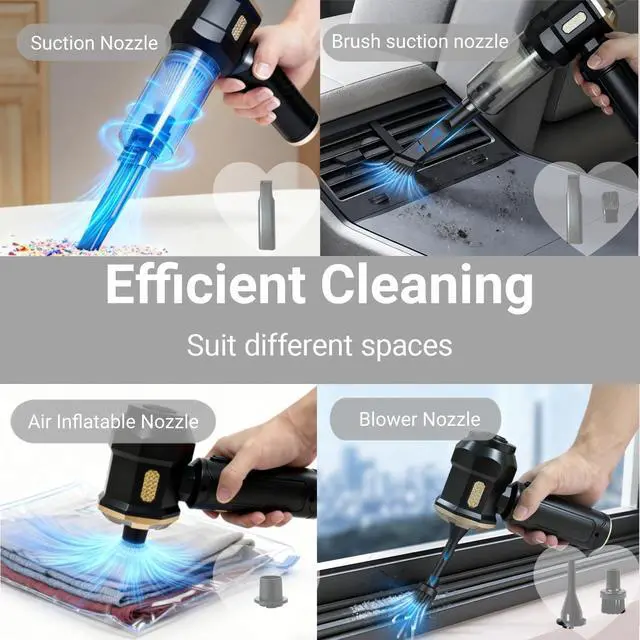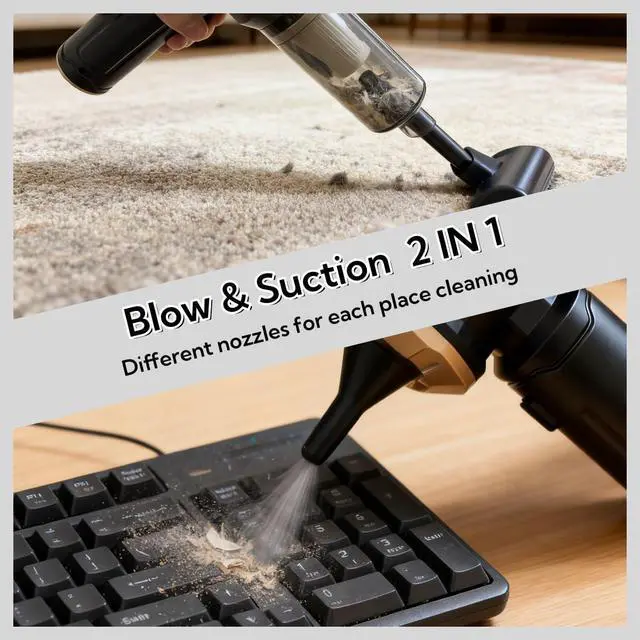 3-in-1 Multifunctional Mini Car Vacuum CleanerOur portable car vacuum is equipped with a variety of accessories to meet various usage scenarios such as blowing, sucking and pumping. It can not only clean computer keyboards, host computers, windows and other difficult-to-clean gaps, but also sofas, seats, cars, woodworking workshops, offices, etc, to meet your various cleaning needs.