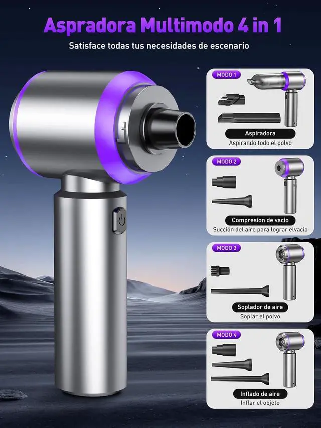 4-in-1 Versatile Car VacuumOur cordless handheld vacuum offers vacuuming, blowing, inflating, and suction, making it your all-in-one tool. Use the vacuum and blowing functions to easily clear away small debris. Inflate balloons or camping mattresses with ease using the inflating feature, or use the blower to boost flames during outdoor activities. Quickly remove air from vacuum storage bags with its powerful suction. All of this is possible with one compact device and its versatile attachments