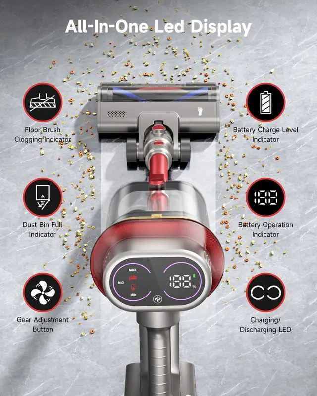 : The AIPOWAY cordless stick vacuum cleaner features a bright, easy-to-read color LED screen that shows real-time updates on suction level, battery life, charging status, and blockages. Designed with everyone in mind including children and older adults this intuitive display makes using and maintaining your stick vacuum cordless simple and stress-free. The vacuum cleaner may not be able to speak, but the screen can.