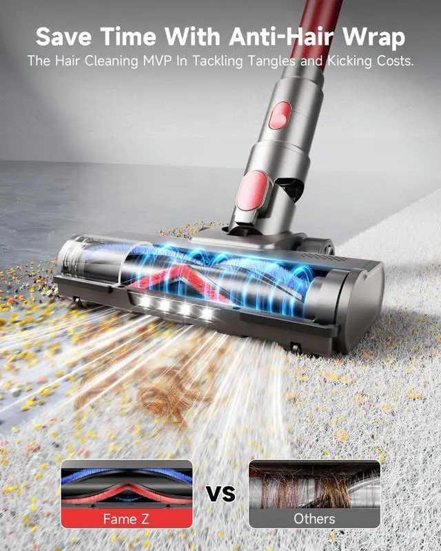 -: Your furry friends won' t want to miss the anti-tangle floor brush of the Fame Z. It can clean the hair on the floor and short pile carpets, and the floor brush won' t scratch the wooden floor. The rollers won' t get tangled with hair and become immobile. Compared to other vacuum cleaners, we have made a special design on the rollers to truly achieve anti-tangle, whether it' s long hair or a large amount of dog haircat hair.