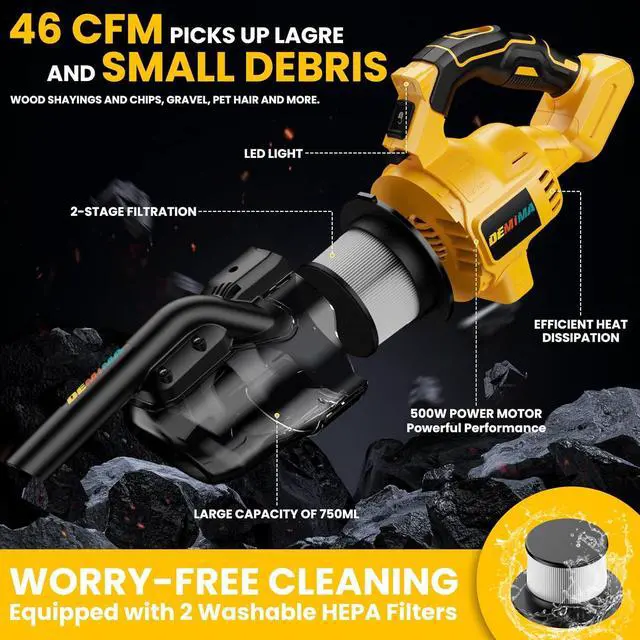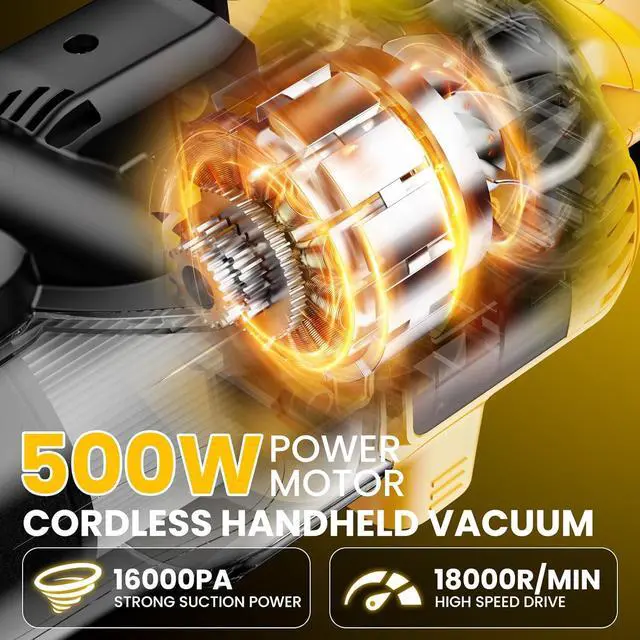 Unleash Unmatched Suction Power: This cordless handheld vacuum cleaner is equipped with a 500W high-power and efficient motor with a turbine blade design that spins at 18, 000 rpm. With an impressive 46 CFM (cubic feet per minute) air flow, this vacuum cleaner provides industry-leading suction power performance, ensuring that no fine dust can escape its cleaning range.