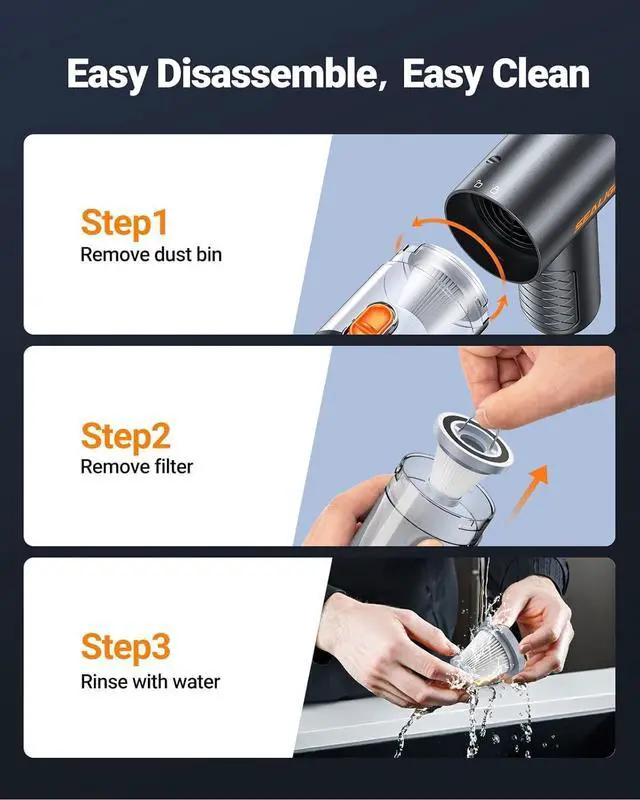 POWERFUL SUCTION: With 22000PA and 400000 RMP motor, our hand held vacuum cleaner can easily remove stubborn stainsand food residues from the gaps. The intelligent temperature control and cooling system protects the motor life, providing a low-noise and efficient cleaning experience