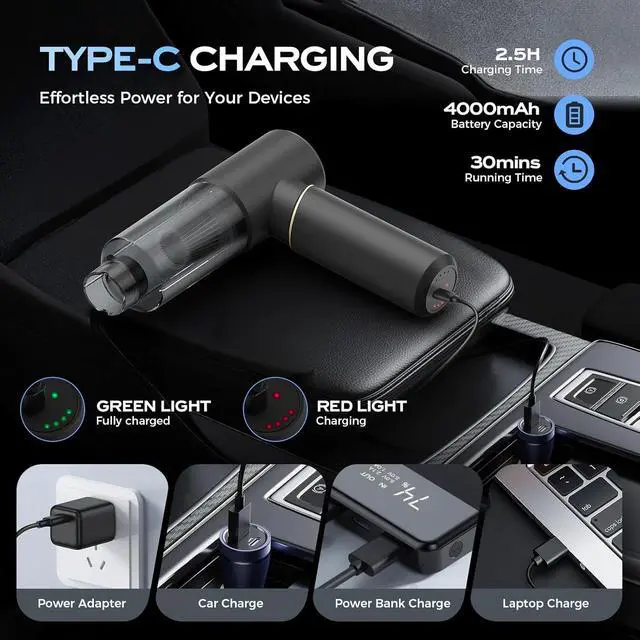 4000mAh Battery & Universal USB-C Charging: This cordless handheld vacuum features a 4000mAh battery for 21 minutes of cordless cleaning. The USB-C charging works with car adapters, power banks, and wall chargers, ensuring your handheld vacuum is always ready when you need it most.