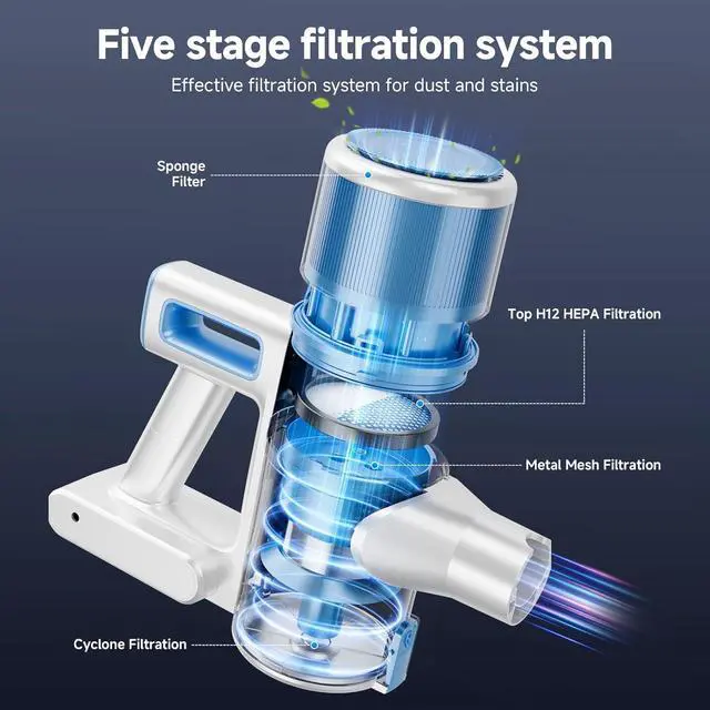 Adv-Filtration SystemStick vacuum cordless rechargeable features a fully sealed cyclone filtration system with a HEPA filter, stainless steel filter, and sponge filters, capturing up to 99.99 % of fine dust particles as small as 0.1 microns. It effectively prevents secondary pollution and ensures clean, fresh air.