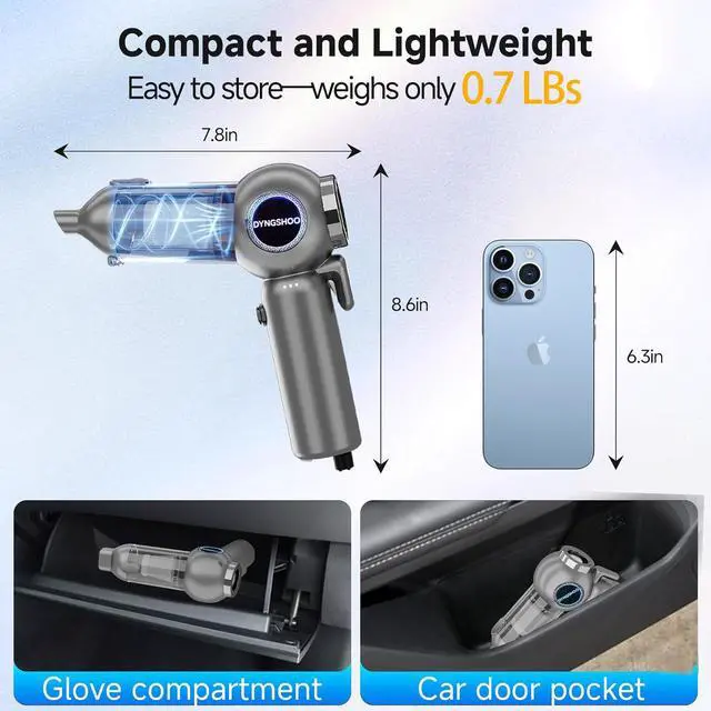 Wireless and lightweight design This handheld vacuum features a cordless design, completely freeing you from the constraints of cords. Weighing just 0.71 pounds, it offers unparalleled freedom during cleaning. Its compact and lightweight form makes it easy to store in your car or any corner of your home, ensuring convenient access whenever needed. It' s the perfect companion for travel or outdoor activities.