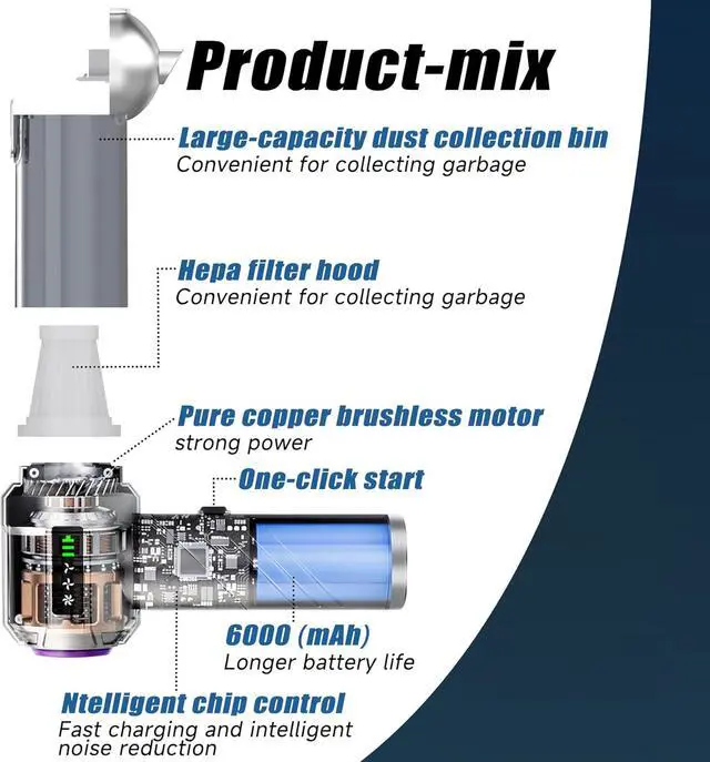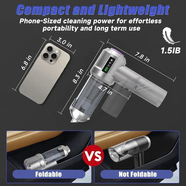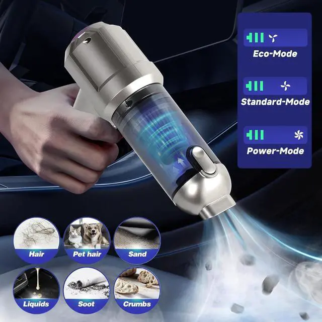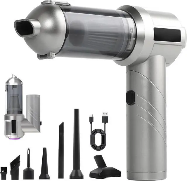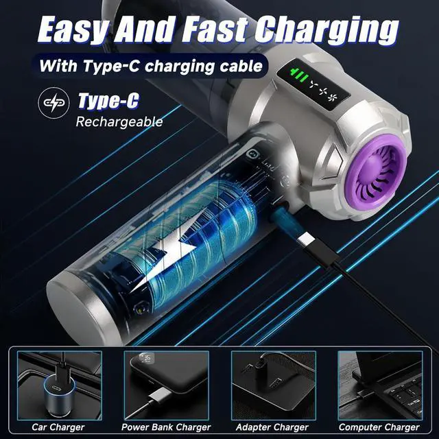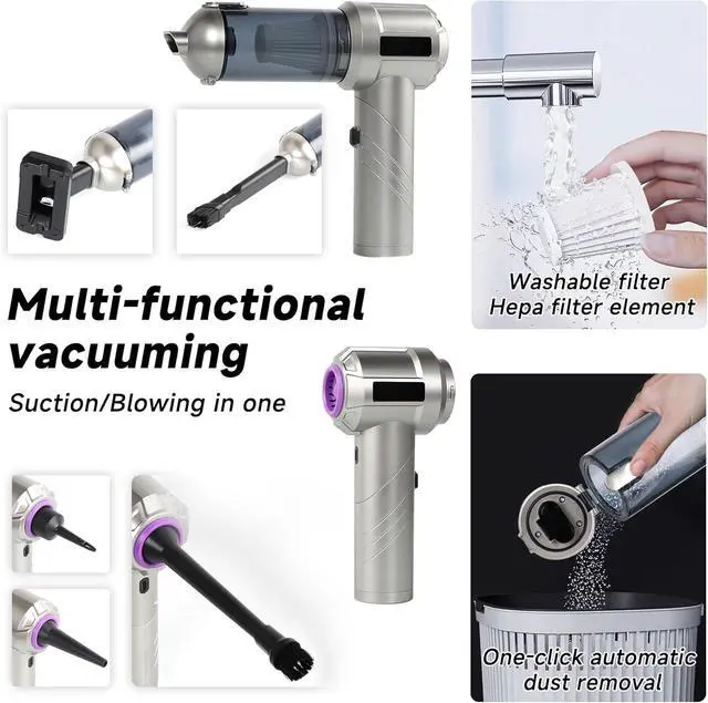 Rechargeable Battery & LED DisplayThe hand vacuum cordless rechargeable, equiped a 6000mAh battery with a fast charging port. It can be easily charged using a car charger, mobile power, laptop, rechargeable battery, and other methods. LED display can show you the current battery level and working mode. This reusable vacuum cleaner is a perfect replacement for compressed air canisters and is environmentally friendly and energy-efficient.