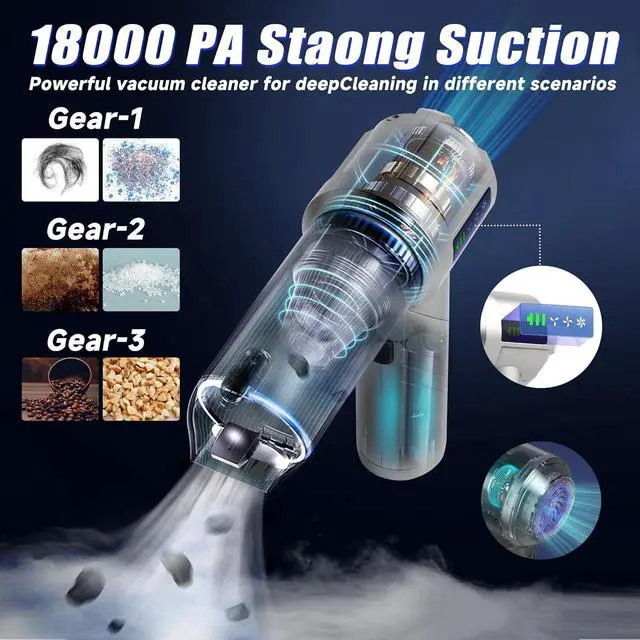 Brushless Motor High PowerHandheld Vacuum Cordless utilizes an upgraded high-speed brushless motor with 18000PA Suction Power. Compared to traditional motors, the brushless design offers stronger suction, enhanced performance, and a longer lifespan