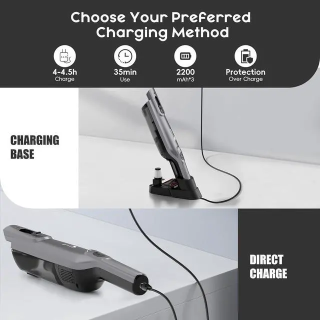 Long-lasting Battery LifeEquipped with three 2200mAh lithium-ion batteries, this rechargeable cordless handheld vacuum offers a maximum runtime of up to 34 minutes. Youll have ample time to complete your cleaning tasks without worrying about battery life