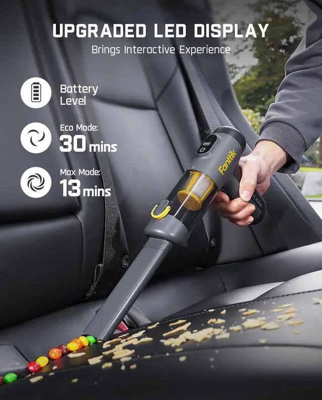 LED Display & Battery Indicator: The handheld vacuum cordless has an LED display screen. Press and hold for 1 second to power it on or off. When turned on, the LED display screen shows the current battery level and suction mode, providing a smarter