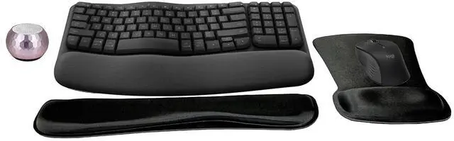 Includes Logitech MK670 USB Keyboard & Mouse, Gel Wrist Pad & Mouse Pad, & Mini Glam wireless Bluetooth 5.0 speaker.