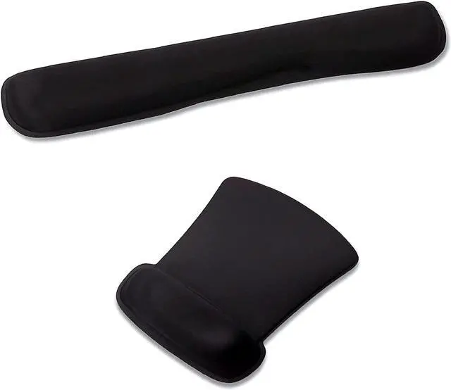 Keyboard & mouse combo features full-size board with numeric keypad, shortcut keys, palm rest, & strong wireless connection.