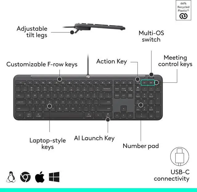 USB-C wired keyboard for organizations or industries that require a wired solution; multi-OS layout allows easy deployment across the company