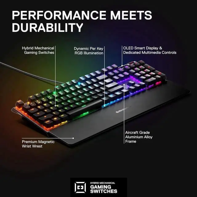SteelSeries USB Apex 5 Hybrid Mechanical Gaming Keyboard Per-Key RGB Illumination Aircraft Grade Aluminum Alloy Frame OLED Smart Display (Hybrid Blue Tactile & Clicky Switch)