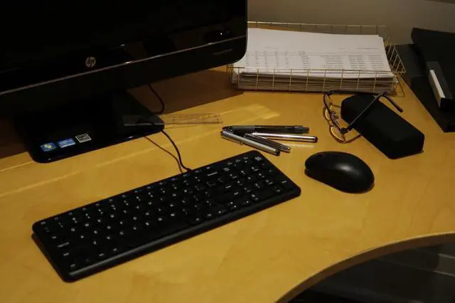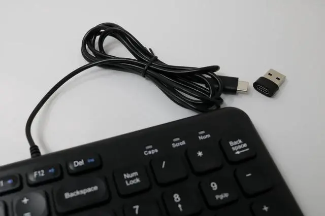 The Matias Compact Financial Keyboard for PC provides the ergonomic benefit of a short reach to the mouse while still keeping the very useful number pad. Keycaps also have slight sculpting for a more ergonomic experience. The wired connection is USB-C, with a USB-A adapter preattached on the end. Remove the adapter if you want to plug the keyboard into your computer's USB-C port.