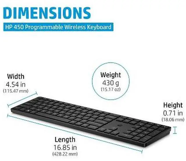 Keyboard contains 62% PCR. Select household wipes can be safely used to clean HP 450 Programmable Wireless Keyboard up to 1, 000